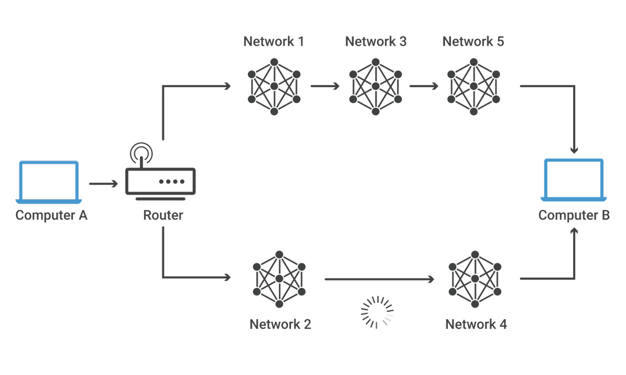 예) 데이터 패킷이 컴퓨터 A에서 컴퓨터 B로 전달되는 경우 네트워크 2, 4를 선택하면 더 짧은 경로이지만 네트워크 1,3,5가 더 빠를 수 있음