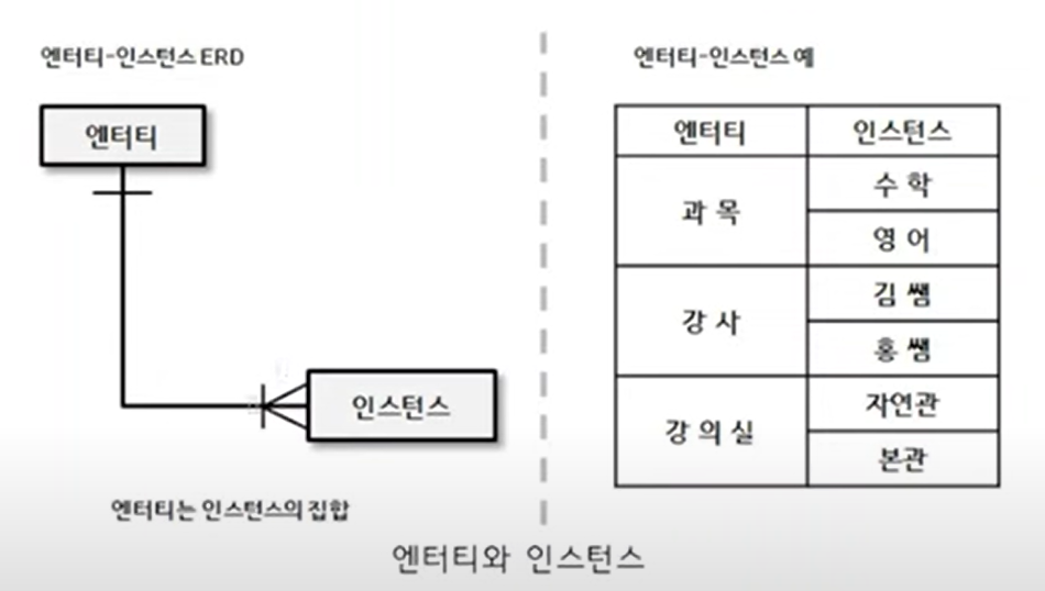 - 인스턴스 : 엔티티의 특정한 속성 값들로 구성, 엔티티의 개념을 현실에서 구체적으로 나타낸 것