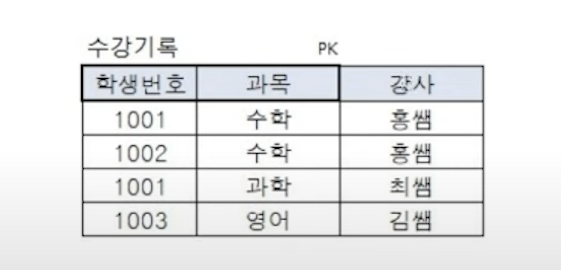 - 예) PK가 (학생번호+과목)일 때, 과목 하나에 의해서도 강사가 결정되는 경우