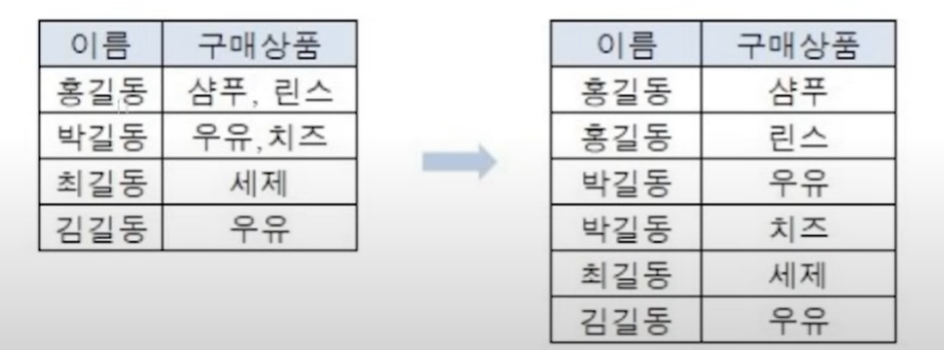 - 예) 구매 테이블의 제 1 정규화 : 상품에 여러 값이 있으므로 이를 여러 인스턴스로 분해