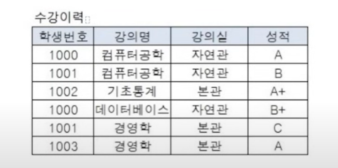 - 수강이력에서는 한 학생이 여러 강의를 수강할 수 있기 때문에 주식별자는 학생번호로만은 불가능 (유일성 불만족 때문)