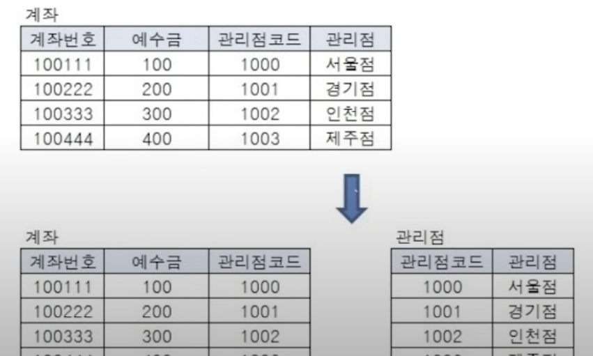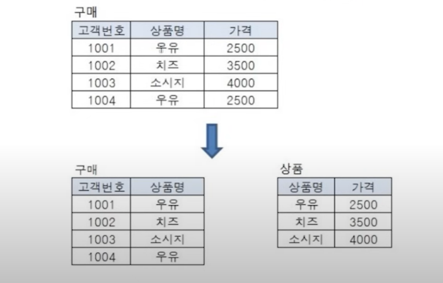 - 이 경우 테이블을 분리하지 않으면, 구매 테이블에서 상품명을 변경해야 하는 상황이 발생할 경우 그 때마다 구매 테이블에서 가격도 변경해야 함
