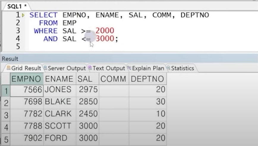 예) SAL이 2000 이상 3000 이하인 직원 정보 출력