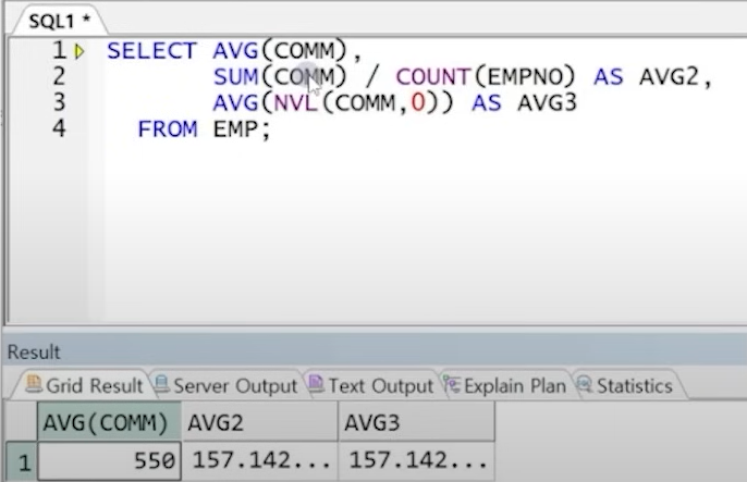 - 숫자 함수 중 여러 값을 전달하여 하나의 요약 값을 출력하는 다중행 함수