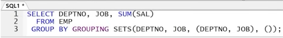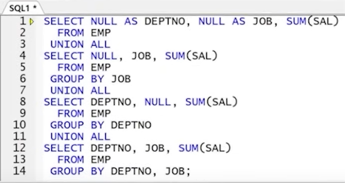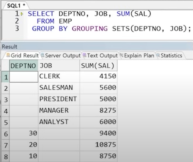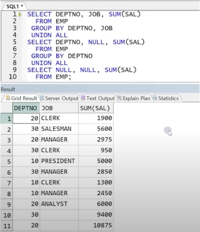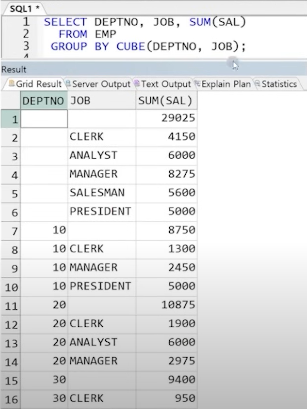 - 사진에 생략되었지만 전체 총합 결과도 출력 (DEPTNO NULL, JOB NULL, SUM(SAL) 29625)