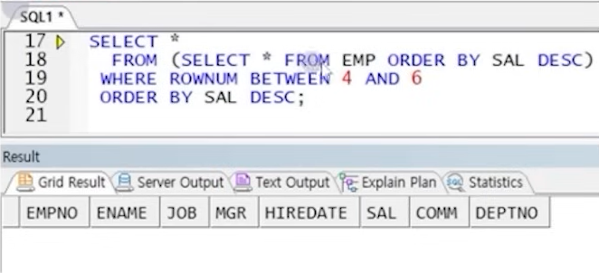 예6) EMP 테이블에서 급여가 높은 순서대로 4~6번째 해당하는 직원 정보 출력