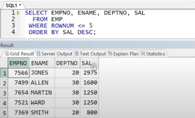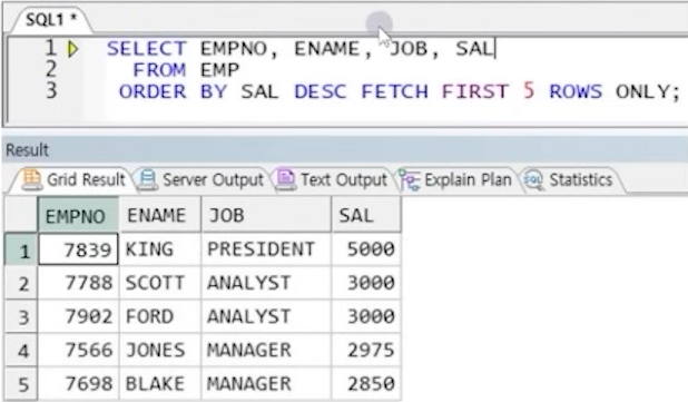 예1) EMP에서 SAL 순서대로 상위 5명 (ORACLE 19C에서 실행)
