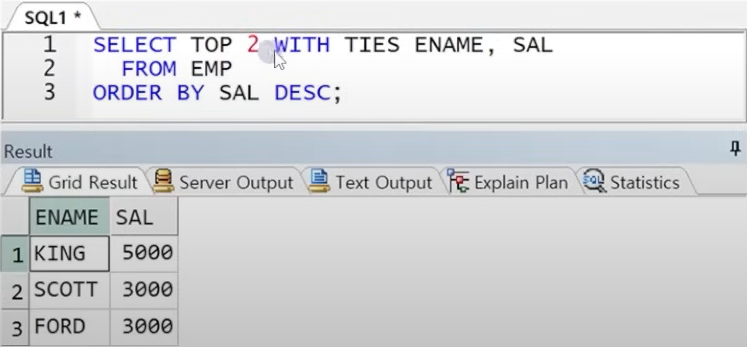 - WITH TIES를 사용하여 동순위까지 함께 출력 가능