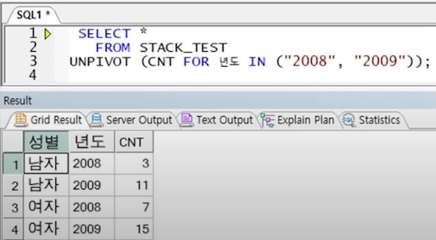 - 반드시 FROM절에 STACK 컬럼, UNSTACK 컬럼, VALUE 컬럼 모두 명시 !