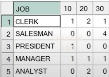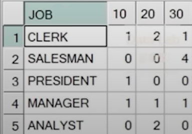 주의) FROM 절 서브쿼리 안에 JOB이 없으면 그냥 부서별로의 도수가 출력됨
