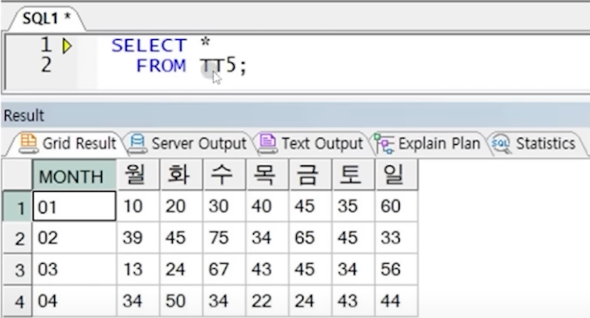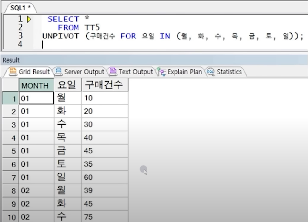 - UNSTACK 데이터의 컬럼 명이 숫자라면 컬럼명은 문자로 저장되므로 쌍따옴표 전달 필수!