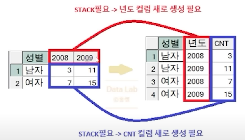 - STACK 컬럼 : 이미 UNSTACK 되어 있는 여러 컬럼을 하나의 컬럼으로 STACK 시 새로 만들 컬럼 이름 (사용자 정의)