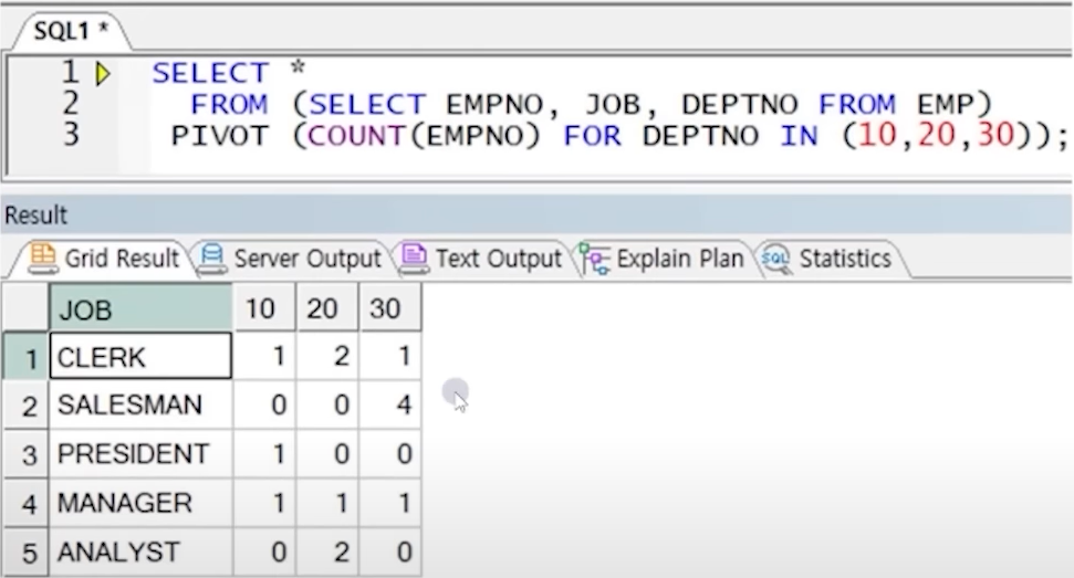예1) EMP 테이블에서 JOB별 DEPTNO별 도수(COUNT) 출력