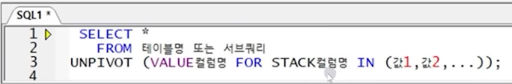 - FROM 절에 STACK, UNSTACK, VALUE 컬럼명만 정의