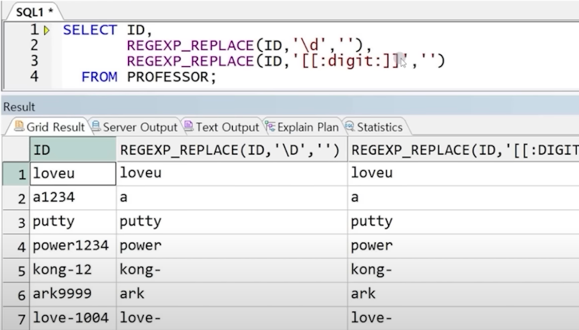 - REGEXP_REPLACE(ID, '[A-z][0-9]', '', 1, 0, 'i') 로 옵션까지 모두 설정하거나 뒤를 모두 기술하지 않고 기본값으로