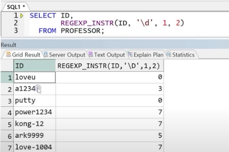 예) ID 값이 숫자로 끝나는 교수 정보 출력