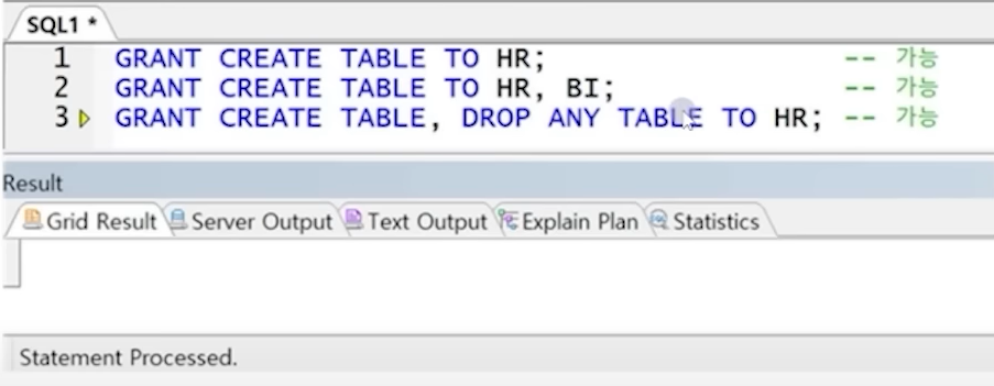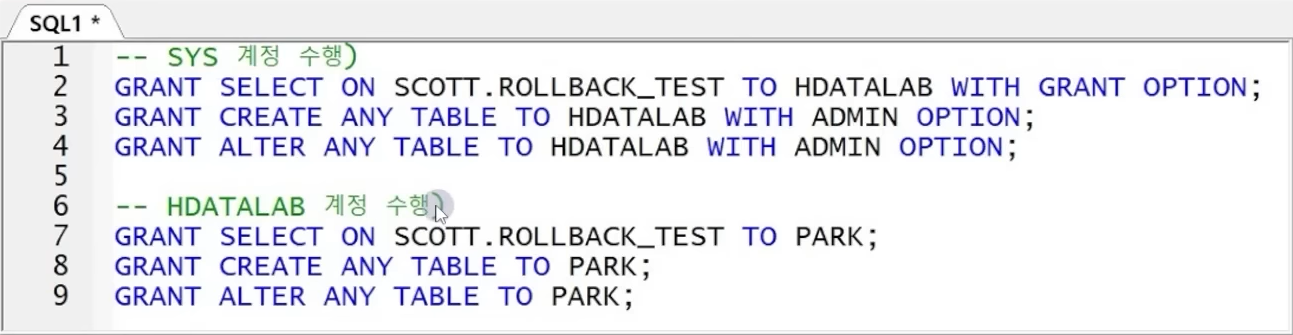 - 테이블 소유자는 타계정에 소유 테이블에 대한 조회 및 수정 권한 부여 및 회수 가능