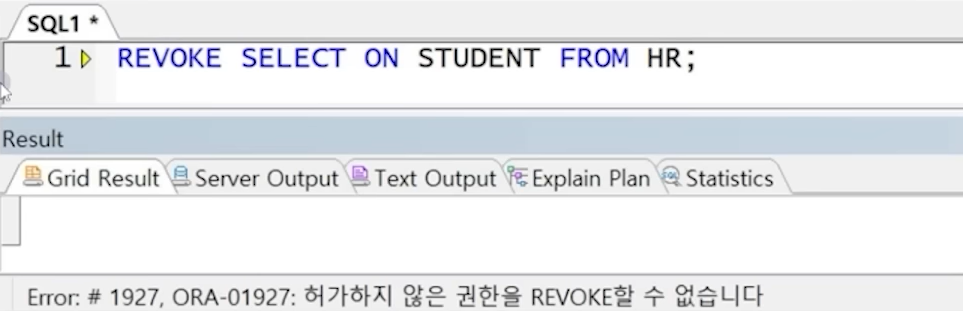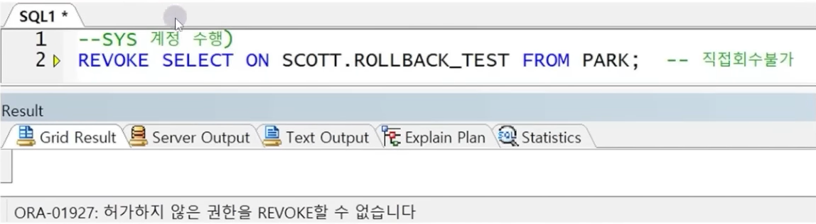 - SCOTT 소유의 STUDENT 테이블이지만 ROLE을 통해 부여된 권한이라면 직접 회수 불가