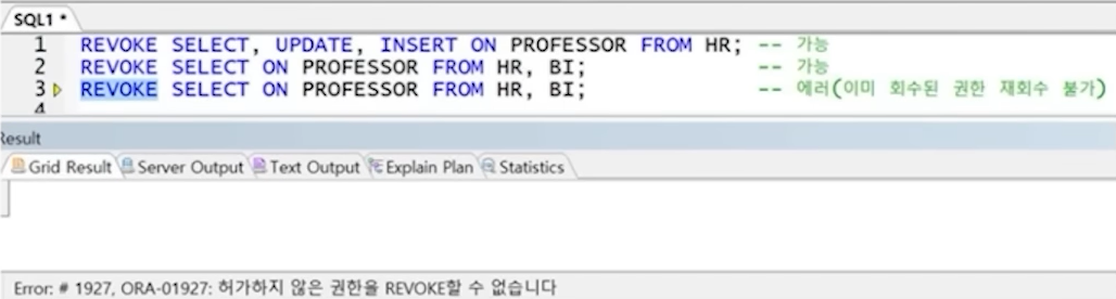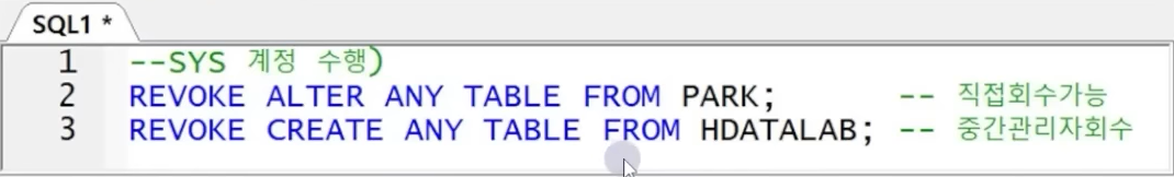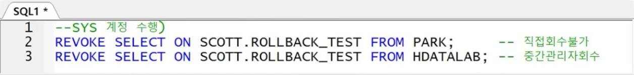 - 중간관리자 (WITH GRANT OPTION으로 권한을 부여받은 자)가 부여한 권한은 중간관리자만 회수 가능