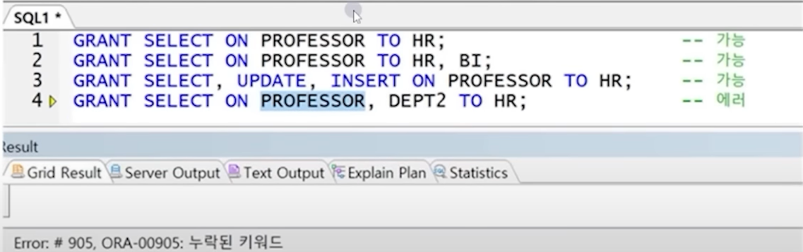 예1) 오브젝트 권한 부여 (PROFESSOR 소유자 실행)