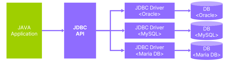 - 데이터베이스마다 커넥션 연결 방법과 SQL 전달 방법, 결과 응답을 받는 방법이 모두 다름
