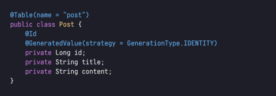 - Post 테이블 그대로 Entity 생성 (getter/setter 생략)
