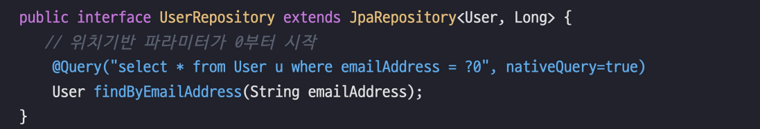 - ?1 ≫ 첫 번째 파라미터인 emailAddress의 값이 전달됨