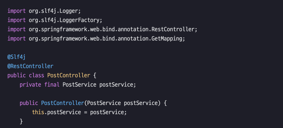 - @Slf4j : Lombok 라이브러리가 제공하는 어노테이션으로, 로거(Logger) 객체를 자동으로 생성해줌
