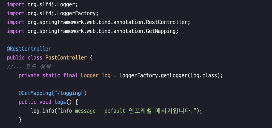 - @Slf4j 어노테이션을 사용하지 않는다면 수동으로 Logger 객체를 생성하여 사용 가능