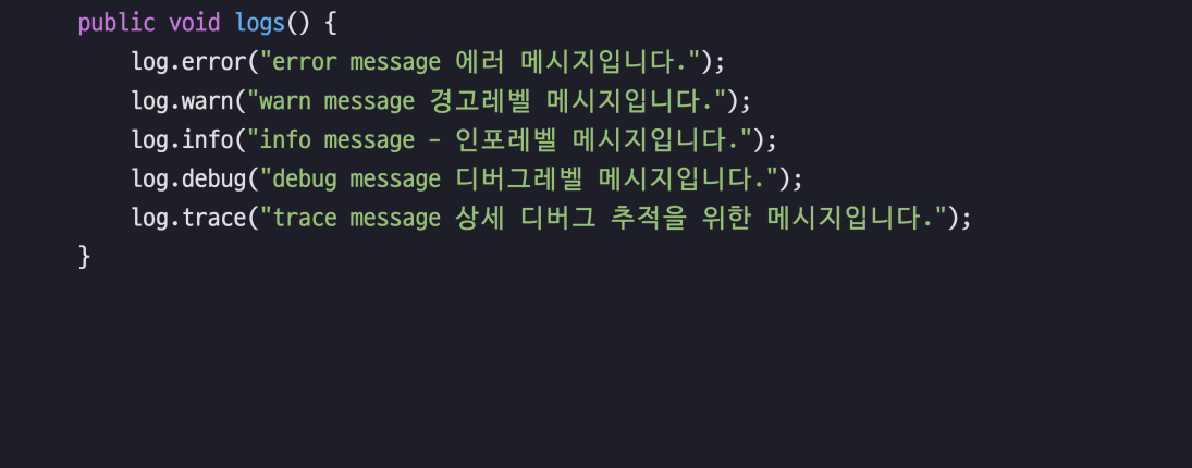 - SLF4J의 간단한 API를 사용하여 로그를 작성하면 됨. 실제 로깅 작업은 선택한 로깅 프레임워크 가 처리